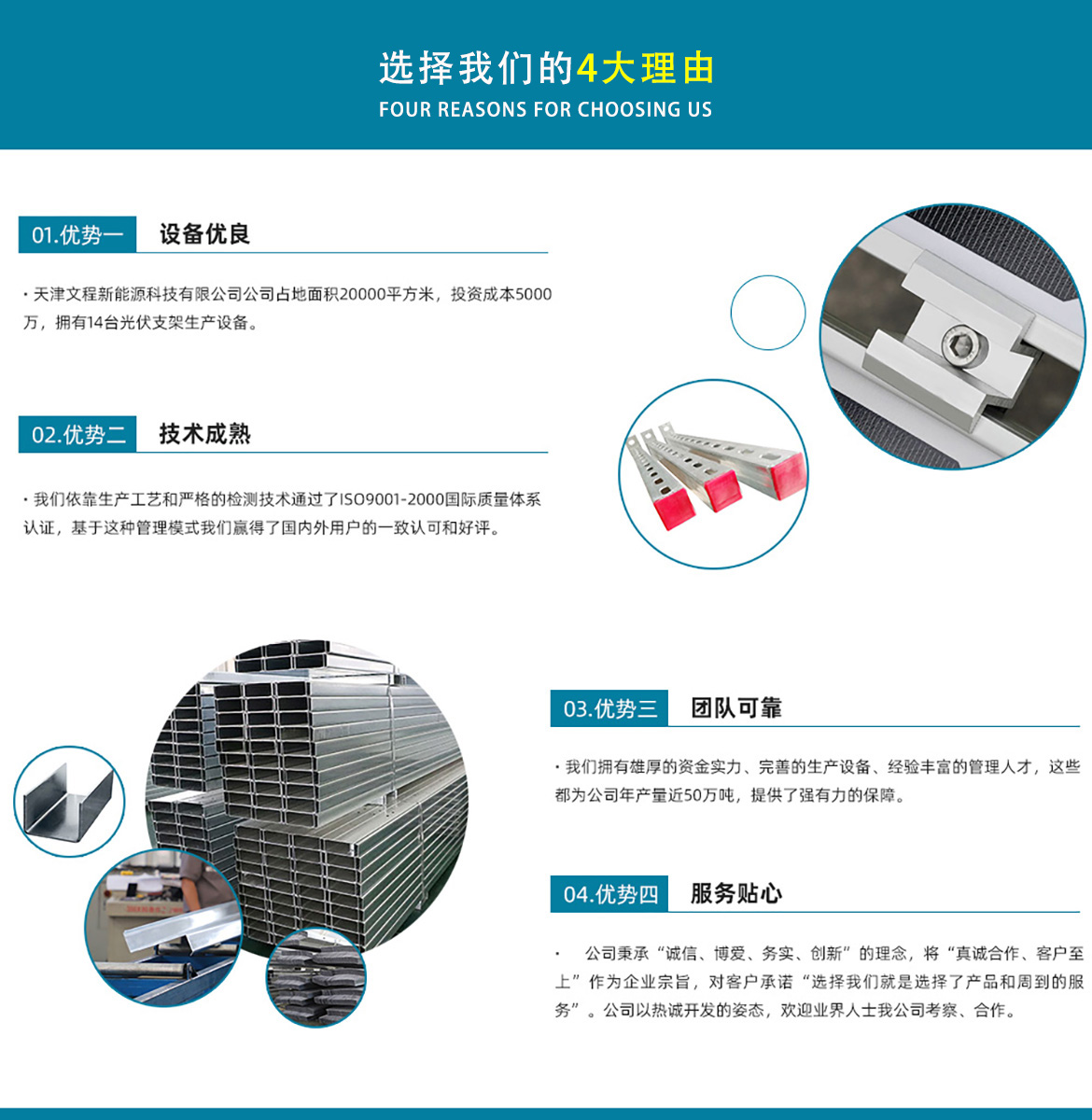 關(guān)于我們天津文程新能源科技有限公司成立于2021年,是專注于集中式、分布式、漁光互補(bǔ)和農(nóng)光互補(bǔ)等清潔能源發(fā)電的綜合性企業(yè) 公司是集設(shè)計(jì)、研發(fā)、生產(chǎn)、制造為一體的綜合型企業(yè)。公司占地面積20000平方米,注冊(cè)資金5000萬元整。公司坐落于華北鋼鐵重鎮(zhèn)--大邱莊,距天津市區(qū)50公里、鄰104和205國道及京滬高速,交通十分便捷。 本公司擁有三個(gè)生產(chǎn)車間,其中兩個(gè)冷彎型鋼車間,一個(gè)鋅鋁鎂型鋼車間,擁有自動(dòng)冷彎成型機(jī)10條,自動(dòng)數(shù)控沖孔機(jī)10條以及焊接加工等設(shè)備。主要生產(chǎn)產(chǎn)品有:太陽能光伏支架、各種規(guī)格的C/Z/U型鋼、抗震支架、管廊支架及整套配件等。